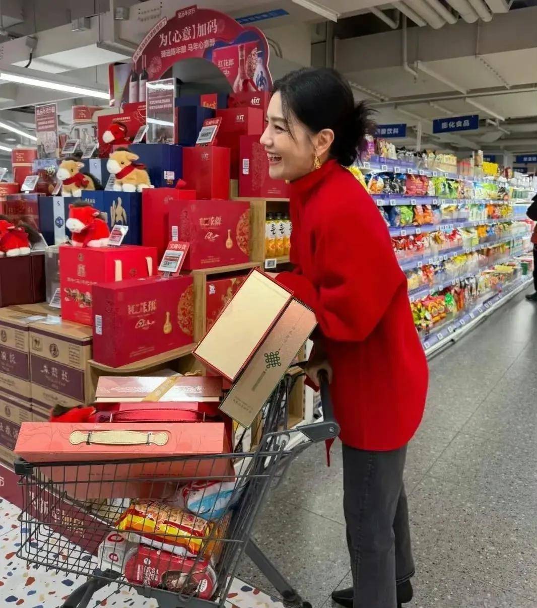 推着购物车的她在年货区认真挑选商品,不时拿起商品仔细查看,与普通消费者无异。尽管是私下行程,但她保持着得体的仪容,举手投足间尽显优雅气质。